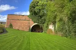 In fortifications designed to resist artillery, a casemate was originally a vaulted chamber usually constructed underneath the rampart. It was intended to be impenetrable and could be used for sheltering troops or stores. With the addition of an embrasure through the scarp face of the rampart, it could be used as a protected gun position.[11] In bastion forts, artillery casemates were sometimes built into the flanks of bastions, but in action they quickly filled with smoke making them inoperable and for that reason, had fallen out of favor during the 17th century.[12]
