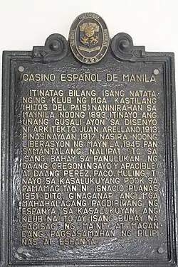 - ^ a b c "National Registry of Historic Sites and Structures in the Philippines: Casino Español de Manila". National Registry of Historic Sites and Structures in the Philippines. National Historical Commission of the Philippines. Retrieved 25 May 2014.