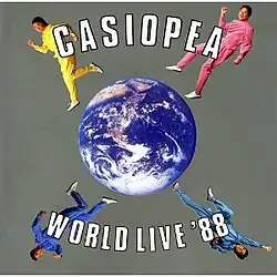 Casiopea World Live '88 is the fifth live album released by the jazz fusion group Casiopea in 1988. It consists of recordings of some of their songs played in concert during Casiopea's World Tour in 1988 that promoted their previous album, Euphony. It is also a collaboration album with two Japanese horn sections from two other bands, the brass section of Spectrum and the brass section of The Tops. Additionally, it is the first album Spectrum recorded since their breakup in 1981, and is their penultimate album (their last album after they broke up was released in 1991 and was a remix compilation album of songs that were hits in Japan from the late 1970s). Lead trumpeter/vocalist of the band, Ichiro Nitta, was also the producer of The Tops at the time this album was released. The Tops released one more album, Soul Children, the following year, before they disbanded in 1991. That same year, Spectrum released their Super Remix album. This was also the last album to feature Tetsuo Sakurai on bass and Akira Jimbo on drums (during his run as a full-time member), who both left to form the band Jimsaku.