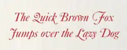 The letterforms of Caslon's roman, or upright type include an "A" with a concave hollow at top left and a "G" without a downwards-pointing spur at bottom right. The sides of the "M" are straight.[10] The "W" has three terminals at the top and the "b" has a small tapered stroke ending at the bottom left.[10] The "a" has a slight ball terminal.[11] Ascenders and descenders are relatively short and the level of stroke contrast is modest in body text sizes. In italic, Caslon's "h" folds inwards and the "A" is sharply slanted.[10] The "Q", "T", "v", "w" and "z" all have flourishes or swashes in the original design, something not all revivals follow.[10] The italic "J" has a crossbar, and a rotated casting was used by Caslon in many sizes on his specimens to form the pound sign.[3] However, Caslon created different designs of letters at different sizes: his larger sizes follow the lead of a type he sold cut in the previous century by Joseph Moxon, with more fine detail and sharper contrast in stroke weight, in the "Dutch taste" style.[12] Caslon's larger-size roman fonts have two serifs on the "C", while his smaller-size versions have one half-arrow serif only at top right.