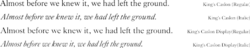 The text styles of King's Caslon have a lower level of contrast between strokes than most earlier Caslon revivals, while the display styles have more contrast.