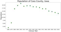 Cass County is a county located in the U.S. state of Iowa. As of the 2020 census, the population was 13,127.[1] Its county seat is Atlantic.[2] It was named to honor Lewis Cass, who was the 1848 Democratic nominee for president.