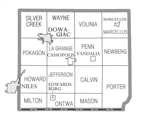 The village of Cassopolis was platted in 1831 and intended as the county seat, because it was the geographical center of the county. It had no settlers at the time.[7]