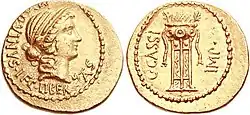 Aureus of Gaius Cassius Longinus, the tyrannicide, 42 BC. The obverse features Libertas, patron goddess of the Cassii and the Liberatores. The tripod is a reference to his position of quindecimvir sacris faciundis.[46] - Cassius Clemens, brought to trial circa AD 195, for having espoused the side of Pescennius Niger, defended himself with such dignity that Septimius Severus granted him his life and allowed him to retain half his property.[47]