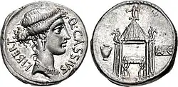 Denarius of Quintus Cassius Longinus, 55 BC. Libertas is portrayed on the obverse. The reverse is a depiction of the Temple of Vesta, where Longinus Ravilla held his trial of the vestals in 113. On the left is a voting urn, and a ballot (tabella) is on the right. It is inscribed A C for Absolvo Condemno ("acquitted" or "condemned"), a further reference to the trial. - Gaius Cassius C. f. C. n. Longinus, son of the consul of 124 BC, triumvir monetalis in 126.[i][9][15]