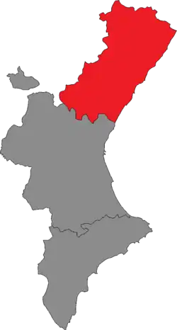 Castellón (Valencian: Castelló) is one of the three constituencies (Spanish: circunscripciones) represented in the Corts Valencianes, the regional legislature of the Valencian Community. The constituency currently elects 24 deputies. Its boundaries correspond to those of the Spanish province of Castellón. The electoral system uses the D'Hondt method and closed-list proportional representation, with a minimum threshold of five percent regionally.