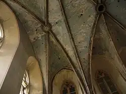 The chapel is of the aisleless type, three-bay, cross-ribbed vaulted.[11][22] The western bay (Neo-Gothic) is slightly narrower than the others, the vault of the central bay is six-part, and the eastern bay is seven-part and has a transverse rib on the axis of the eastern wall.[1][11] In the keystone there is a Neo-Gothic heraldic cartouche.[1] The ribs of the eastern and central bays date from the turn of the 15th and 16th centuries, with a profile in the form of a roll with a break.[1] The ribs flow into columnettes with chalice capitals from the late 13th century in the corners and the north wall.[1][7][22] The capitals are decorated with floral and flower motifs.[1] Triple shaft bundles are located between the bays. The southern wall has shafts from the turn of the 15th and 16th centuries. The shafts are profiled and have corniced capitals. The shafts on the north side are cantilevered on brackets decorated with plant motifs, probably partially reconstructed in the 19th century. The shafts on the southern side reach the cornice, which runs around the interior at the height of the window sills.[24]