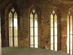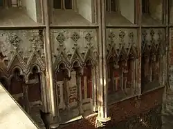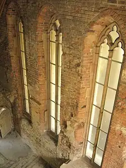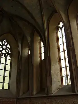 The chapel windows are divided and have tracery.[7] The side walls of the eastern and central bays have two two-part pointed-arch windows, while the eastern wall has two three-part windows with tracery. There is also tracery with a fish bladder motif on the eastern wall, which was probably reconstructed. The windows on the north side have tracery with a trefoil motif, also partially reconstructed.[24] There are sedilia niches under the windows. Between the shafts in the eastern part of the north wall there are 3 niches, which are closed with trefoil and surrounded by richly profiled frames, the closures of which are slightly cantilevered. Triangular wimpergs with stylized crockets and crosses are present in the crowning.[7][24] At the base of the sedilia there is a cornice.[24] In the middle bay on the north side there is a passage to the castle. In the western part there is a matroneum half the width of the bay. The chapel is surrounded by buttresses with a stone cornice.[7]