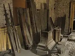 In the crypt there was a tombstone of Joanna Wilhelmina Ihlee née Gröschner (died 1790). The slab was marble, had an inscription, and the ornamental top depicted the sun. In addition, the chapel housed six pewter lanterns from the first half of the 19th century.[24] In the museum in Racibórz there is a painting of St. Thomas Becket from the altar and statues of the apostles that adorned the dismantled canon sedilia.[6][8]