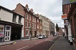 The street is bisected roughly half-way up by Maid Marian Way and the two halves have rather different natures. Below Maid Marian Way the street is wider and most of the imposing buildings date from the 18th century of later, whilst in the higher part the streetscape is smaller scale with earlier buildings. Perhaps reflecting this, the lower part of the street is in the city's Old Market Square conservation area, whilst the upper part is in the Castle conservation area.[3][4][5]