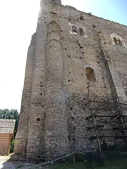 The western wall of the structure remains, exhibiting reinforcement by three buttresses and two round-arched windows, in addition to a small portion of the northern return wall. The west face of the keep displays evidence of tearing, which corresponds to the anchoring of its missing walls. This allows for the reconstruction of its footprint. At the level of the remains of its northern wall, which is several meters high, the jamb of a window, possibly a door, remains in place.[41] Its masonry also includes travertine blocks, which may have been salvaged during the partial reconstruction of the keep from structures of the main tower, where these stones had already been reused.[42]