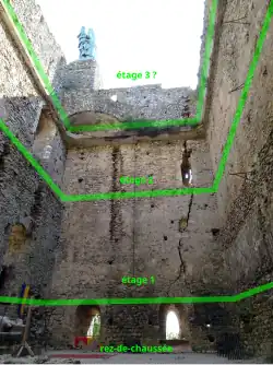 The internal dimensions of the main tower are 15 meters in length and 9 meters in width. The different floors of the keep are separated by floors supported by ledges on the north side and beams embedded on the opposite side. These floors may have been pierced with a trapdoor, which would have allowed communication between the levels by ladders or wooden stairs. However, no remains of stone stairs have been found.[15] The door, located at ground level on the west side of the wall, provides access to the infilled ground floor. It appears to be a relatively modern addition, potentially dating to the 1820s. This would have allowed access to the top of the keep from the inside, which was subsequently used to support a telegraph.[36][D 10]