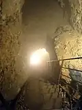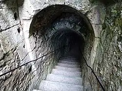 The subterranean passages of the fortress, unearthed and partially investigated in 1857, originally encompassed a length of 14 km across three levels, extending beneath the town.[46] Identified at a depth of a minimum of 14 meters, they are primarily composed of quarries used for extracting building materials for the fortress, the majority of which were subsequently vaulted. They are predominantly in a state of disrepair, either due to natural collapse or deliberate filling.[46]
