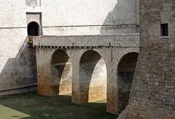 Once past the ravelin, until Grisotti's restoration, the entrance bridge to the castle was supported by three massive vertical piers and as many arches, in addition to a smaller arch connecting the last pier with the castle which can be dated to around the 19th century, thus after the removal of the drawbridge.[note 6] Restoration work, considering the precarious condition and lacking historical matrix, led to the demolition of the latter arch and, due to the discovery of the support point of the ancient drawbridge built at the end of the 16th century[55] and remained there until its removal in 1861,[92] to the construction of a fixed wooden connecting structure that would evoke the ancient movable protection system.[95] The wooden bridge underwent new maintenance in 2008, with the replacement of the wooden beams.[96]