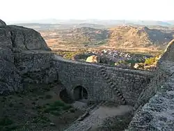 The enclosure includes four towers attached on the outer side of the walls. Two have rectangular plans and are devoid of spans, in the north; an identical tower on the east; and a square-shaped tower on the south, with access via a flight of stairs perpendicular to the adarve, presenting a straight lintel doorway in the northern elevation. Inside the enclosure is a cistern next to a cliff, presenting two full arches and absence of cover.[1]