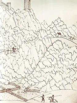 The walled enclosure, adjacent to the main entrance, features a rectangular outline and a full arch door inserted in the south section, that includes battery with four canon emplacements, equipped with two ramps.[1] Inserted into the western side is an irregular oblong segment with full arched door and protrusions that integrates a square-shaped tower on the exterior.[1] A geodetic marker is situated over this segment. From this enclosure are rocky outcroppings with grooves and rubble corresponding to the foundations of other towers and missing wall segments.[1]