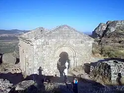 The unique nave temple is situated on a slope accessed by seven steps and conserves a rectangular altar, fragment of baptismal fountain (in the form of a chalice), columnar base and other fragments of granite.[1] A triumphal arch are supported with posts decorated with armillary spheres.[1] The bell tower is situated on a granite cliff, over two/twin arches.[1]