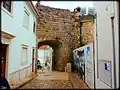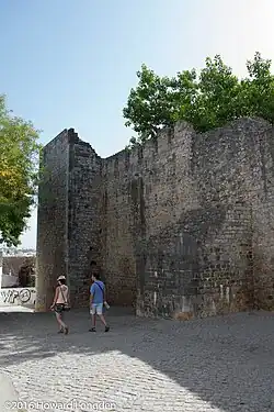 This initial structure was reformed in the Almohad period, when it acquired the main elements that have survived to the present day, from which remains of rammed-earth walls survive. In the area of the current Praça da República, next to the Overseas National Bank building, an old horseshoe arch door was found, associated, in its origin, with a defensive tower. In the area of the current alcáçova, an albarrã tower still remains, multifaceted and facing south, detached from the other structures.[2]
