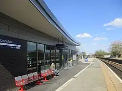 Castleford railway station is situated on both the Hallam and Pontefract lines; these lines connect the town directly with Leeds, Barnsley, Goole, Pontefract and Sheffield. All trains arrive from the west and leave in that same direction.[23] In January 2021, the station was completely revamped, providing a modern waiting facility, sheltered cycle parking and changes to the car park layout.[24]
