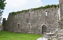 The surviving buildings, mostly dating to the 15th century,[8] are the nave, half the tower, parts of the dormitory. In the chancel there is a stone altar. In the west gable is a pointed doorway. Above it is a two-light window with ogee heads.[9]
