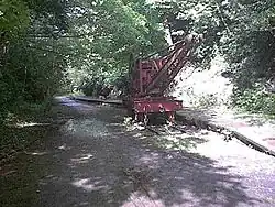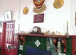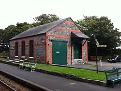 On the rear goods siding, one of the railway's three breakdown cranes was stored for a number of years, being removed in 1991 and subsequently restored and placed on display at Union Mills on the site of the former railway station. This crane was constructed in 1893 by the Birmingham-based firm Richard C. Gibbins. Inside the station's waiting room are several framed displays charting various historical aspects of the railway featuring old photographs, framed tickets, maps and other historical documentation relating to the earliest days of the railway. A headboard commemorating the centenary of the adjacent Poulsom Park in 1996 is also mounted on the wall above the fireplace, several other pieces of ephemera are available to view at the station. For many years, there also featured large advertisement hoardings lining the down platform but these were removed in 1974 having become unsafe. An original signal windlass constructed by the Birmingham company A.J. Linley & Co., was also displayed on the up platform for many years, a similar version is extant and used to operate the unique slotted post semaphore signal which protects the station's southerly side.