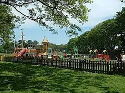 To the northeasterly side of the station lies this park, provided and funded by a generous benefactor to the town and being established at around the same time as the railway and it is from this benefactor that the park takes its name; it consists of a large grassed area and is surrounded by perimeter railings within which are contained playground equipment for children and two football/rugby pitches which form the home grounds and changing rooms for the local clubs. The play equipment has been greatly improved in recent times, the standard slide and swings being replaced by a pirate ship-themed set of equipment. The park is accessed either from a wide path that passes underneath the railway at the south-western end, or via a set of steps accessed from the station platform. More recently the area has become home to a skateboard park which is viewable from the passing trains; this facility is popular with local children who use the facilities for both skate boarding and stunt bike racing. Such is the popularity of the park with travellers that it can be accessed directly from the line's northbound platform; the area is a popular site for campers in the summer months as well as being home to the local football and rugby teams who regularly play matches there. The brick-built changing rooms and club house facilities for the rugby team are located at the northern end of the park, close the skatepark. A macadam pathway around the perimeter of the play park, and sporting fields is a popular with walkers and a regular Walk & Talk event takes place here. In more recent times the park has been plagued by vandalism which has resulted in the installation of closed circuit television cameras to monitor and apprehend culprits.