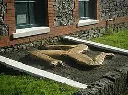 Also at the station, to the side of the goods shed in a gravelled raised section of the lawn is a large cast concrete Triskelion or Legs Of Mann at platform level, painted in a yellow and red colour scheme. It is believed that this piece was relocated from the long-closed stopping place at Peel Road on the Ramsey Line, and was relocated at some point prior to the closure of these other lines in 1968, and prior to 1975 when the Peel Road site was cleared. This feature originally had a gravel surround which was later replaced with grass. In 2012 the Friends Of... group restored the item, repainting it to a golden colour scheme with red gravelled surround to mimic the colourings on the national flag though it returned to its more familiar red, yellow and black setting in the spring of 2016. Originally the feature also had a large circular surround although this was beyond repair to be removed from the original site.