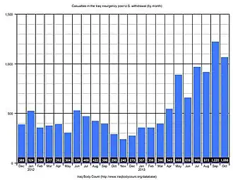 July 2012 was the deadliest month in Iraq since August 2010, with 325 deaths; 241 civilians, 40 police, and 44 soldiers. The month also saw 697 people being wounded by violence; 480 civilians, 122 police, and 95 soldiers. The rise in violence was linked to Sunni insurgents trying to undermine the Shia led government.[28] According to government figures, at least 164 Iraqis were killed during August 2012 – 90 civilians, 39 soldiers and 35 policemen, with 260 others injured.[29] September was a particularly bloody month, with government reports citing at least 365 deaths (182 civilians, 95 soldiers and 88 policemen) and 683 injuries (453 civilians, 120 soldiers and 110 police).[30] Government casualty tolls released for the month of October showed a total of 144 people were killed (88 civilians, 31 policemen and 25 soldiers), and another 264 were wounded, including 110 civilians, 92 policemen and 62 soldiers.[31] At least 166 people were killed throughout Iraq in November 2012 according to government casualty tolls, and 208 died in December, including 55 policemen and 28 soldiers.[32][33] During January 2013, at least 246 people were killed nationwide (including 30 policemen and 18 soldiers), while 735 others were injured.[34] Government figures remained low in February 2013, with a total of 136 killed (88 civilians, 22 soldiers and 26 policemen) and 228 injured.[35] There was a slight increase in March, when according to government sources 163 were killed and 256 injured nationwide, though officials in Baghdad stressed that these numbers did not include the Kurdish regions.[36]