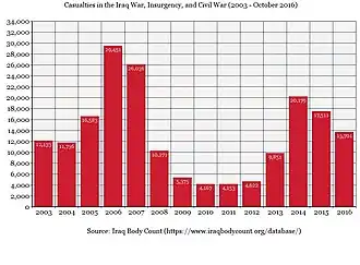 - ^ "Iraq 2014: 48,590 Killed and 26,516 Wounded". Antiwar.com. 1 January 2015.