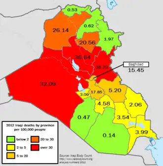 - ^ "Iraq violence drops off sharply in October". The Daily Star Lebanon. 8 November 2012. Archived from the original on 8 November 2012. Retrieved 8 November 2012.