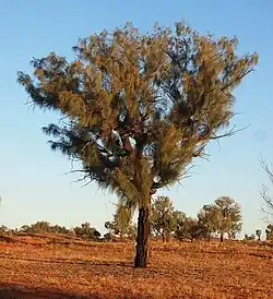 Allocasuarina decaisneana, commonly known as desert oak, desert sheoak,[3][4] or kurkara by the Anangu peoples,[5] is a species of flowering plant in the family Casuarinaceae and is endemic to Central Australia. It is a dioecious tree that typically grows to a height of 10–16 m (33–52 ft) and has long, drooping branchlets, the leaves reduced to scales in whorls of four, the mature fruiting cones 28–95 mm (1.1–3.7 in) long containing winged seeds (samaras) 8.5–17 mm (0.3–0.7 in) long.
