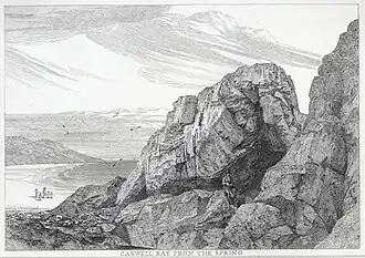 Between 1829 and 1840 much of the land around Caswell Bay was bought by John James, a former Curate of Bishopston, for his daughter and his son-in-law, Charles Morgan.[7] In 1846, The Morgans sold a piece of land on the eastern side of the bay to 19th Century pioneer photographer John Dillwyn Llewelyn who was a regular visitor to the bay. Llewelyn built a holiday home, Caswell Cottage, which stood until around 1960 on the site of what is now the Caswell Bay public car park.[8] In 1854 images of two of his photographs of Caswell Bay were requested by Prince Albert.[9] In August 1878 Llewelyn's thirteen-year-old grandson drowned whilst swimming in the bay, with the inquest held at the Caswell Bay Hotel.
