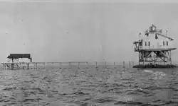 The previous year, a new lighthouse was erected, a square screw-pile structure.[1] Erosion and storms continued to be problems, and in 1900 riprap was piled around the piles to stabilize it.[3] In 1937 the light was discontinued due to decreasing traffic through the area.[3] The house stood abandoned and eventually burned in 1961.[3] The iron foundation continues to stand and appears as a hazard on NOAA charts.[5] It is also a local fishing spot, known affectionately as The Bird Cage.
