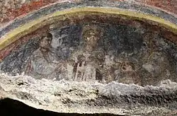 Saint Thecla was a woman from Iconium, Asia Minor, living in the mid-first century. She was betrothed to a nobleman but, upon hearing the Apostle Paul preach, she converted to Christianity, left her family, and followed him. Thecla, inspired by Paul's discourse on the virtues of chastity, wanted to remain a virgin, angering both her mother and her suitor. Soon after followed a series of arrests, death sentences and attempts to kill her, all of which she survived. Her cult following grew and spread around the Mediterranean world, reaching Rome as well. One rendering of the legend has Thecla travelling to Rome to see the Apostle Paul, who was later put to death in the city.[5] It is unclear whether she died here or in Asia Minor, but it is clear that she had followers in Rome. Since the catacomb was built sometime after the saint's death, then it is possible that her remains were later brought to the current site from either within Rome, or even as far as Seleucia in Asia Minor. However, if the occupant of the tomb is not the Saint Thecla, then it was a Roman woman of the same name.