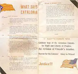 In December 1918, two months after the armistice that put an end to the First World War was signed, radical Catalan nationalists formed in Paris the self-styled "Catalan National Committee", which imitated the Czech National Committee, to demand that the victorious countries deal with the "Catalan lawsuit". In the name of the "Catalan Legion" —the Catalans who had enlisted in the French Foreign Legion to fight against the Central Empires, and who the nationalist propaganda put at twelve thousand, although today that number is considered to be greatly inflated—the Committee sent a letter to the North American president Woodrow Wilson in which they asked for "the revision of the ignominious Treaty of Utrecht and to allow the Catalan Nation, free and independent, to enter to occupy in the League of Nations the place that corresponds to it by its glorious past and by its present flourishing". There is no record that they received any response and the "Catalan dispute" was not included in the agenda of the Paris Conference. In fact, when in January 1919 the Committee intended to organize in Paris a tribute to the Catalan volunteers who had fought in the "Great War", the French government did not allow the Estelada to be displayed or to be used as an act of propaganda in favor of independence and forced the meeting to be presented as a tribute to the "Spanish volunteers".[33]