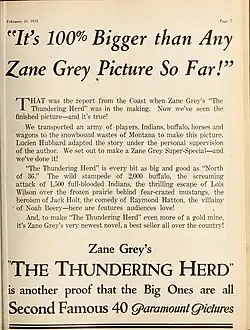 Registered as privately owned agricultural livestock in a fenced-restricted area, it has been commonly reported that the bison were imported in 1924 for the silent film version of Zane Grey's Western tale, The Vanishing American.[2] However, the 1925 version of The Vanishing American does not contain any bison and shows no terrain that resembles Catalina, according to Jim Watson, columnist for The Catalina Islander newspaper. In an October 6, 1938 article in The Catalina Islander, he attributes the bison's arrival to the filming of The Thundering Herd, a silent film released in 1925.[3] A September 1938 article in Nation's Business said the herd then numbered about 30 animals and was left behind with Wrigley's permission after a Lasky Western filmed on the island in 1925.[4] Contemporaneous reports in the Los Angeles Times and New York Times state that The Thundering Herd used a collection of Yellowstone National Park animals herded together for the movie.[5][6] Other shooting locations were the Sierra Nevada mountains and Calabasas.[7][8]