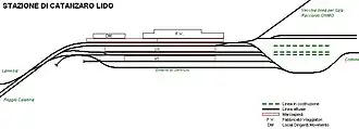 The opening in 2008 of a diversion of the Lamezia Terme line between Settingiano and Catanzaro Lido (via the new Catanzaro station) eliminated a significant constraint in the station's track layout. Previously, trains arriving from or departing to Lamezia could do so only from track 1 or track 2. The diversion has radically changed the entire track layout, which is still being finalised at the Crotone end of the station yard. The main path into the station from that end now corresponds to track 1, but the completion of that end will in all likelihood divert the main path to track 3, as it is perfectly aligned with the two outgoing lines at that end.