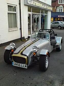 Caterham Cars Ltd. is a British manufacturer of specialist lightweight sports cars established in Caterham, England, with their headquarters in Dartford, England. Their current model, the Caterham 7 (or Seven), originally launched in 1973, is a direct evolution of the Series 3 Lotus Seven designed by Colin Chapman. In the 1990s the company made the Caterham 21, a two-seater soft top alternative to the MG F and Lotus Elise, (which both sold many more units). A track-only car, the SP/300.R, a joint project with Lola was released for customer testing in 2010 and was scheduled for release in 2013.