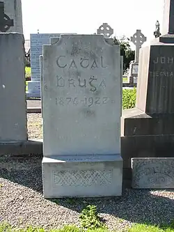 Most of the anti-Treaty fighters under Oscar Traynor escaped from O'Connell Street when the buildings they were holding caught fire, leaving Brugha in command of a small rearguard. On 5 July 1922, he ordered his men to surrender but refused to do so himself.[12] In Thomas Lane he then approached the Free State troops, brandishing a revolver and sustained a bullet wound to the leg which 'severed a major artery causing him to bleed to death'. He died on 7 July, eleven days before his 48th birthday. He had been re-elected as an anti-Treaty TD at the 1922 general election but died before the Dáil assembled.[13] He is buried in Glasnevin Cemetery.