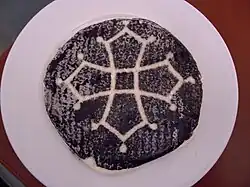 Cathare is a goat's milk cheese from the Languedoc-Roussillon region of France.[1] The cheese comes in flat discs whose face is covered in charcoal powder with the Occitan cross inscribed. Under the rind, Cathare is pure white with a soft, creamy texture.[2] Its goat-milk flavor intensifies as it ages,[3] and reaches its prime after two to three weeks, which makes it typically unavailable in the United States, due to the Food and Drug Administration's stance that raw milk soft cheeses can pose a health risk.[4] The sale of raw milk cheese aged under 60 days is illegal in the United States.[5]