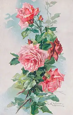 In addition to the popular depictions of flowers, Klein has also illustrated publications for the botanical world in the 1890s. These included, for example, the two-volume overview work Vilmorin's Blumengärtnerei, the Rosen-Zeitung, the French Journal des Roses and the journal of the German Dendrological Society.[15] There was also a major contribution to Parey's Blumengärtnerei, a standard work of horticultural literature at the time, which she was unable to complete.[16] She died on November 30, 1929, at the age of 68 in Berlin-Charlottenburg.[2] Her remains were removed from her grave in 1953 as she was not considered a sufficiently significant artist by the cultural authorities.[15]