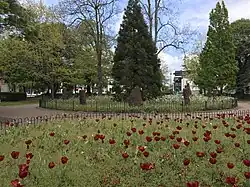 Friary Gardens is a 1 acre (0.40 ha) triangular formal garden, which was established as a Dutch garden.[40][46] One of the strict conditions of the sale of Cathays Park by the 3rd Marquess of Bute was that the trees must be preserved and that no buildings should ever be built on the site of the gardens.[47] Work began in the autumn of 1904 and was completed by 27 September 1905, when it was handed over to the Parks Committee, although not opened to the public until 1910.[40][46] For many years the gardens were known as the Dutch Garden.[46] In 1923 the Parks Committee decided to rename it Priory Gardens. However, this name was historically incorrect and in 1928 the Parks Committee renamed it as the Friary Gardens.[46]