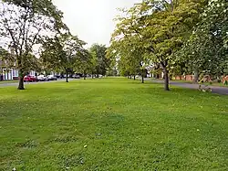 Queen Anne Square at the very north end of the park, is a tree-lined grass square with domestic houses which was built in the 1930s and 1950s. It was designed to be aligned with the main thoroughfare of King Edward VII Avenue, on a site that was originally planned for a Welsh Parliament House.[50] The square is enclosed by a tree-lined no through road, by Corbett Road to the south and by Aberdare Hall to the south east.