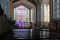 Dorothy Hughes, who was brought up in Kenya, designed the current building in 1960. The cathedral was constructed by the British company Mowlem. The modernist cathedral features abstract stained glass in stainless steel frames. The cathedral's specification included details in carrara marble[5] and seating for 3,000 to 4,000 people.[2] This is ten times the number of the original stone church. The building is 98 feet high and features a large cross. Hughes' design features eight different chapels in addition to the two main halls. There is a main altar with a large crucifix and a large sanctuary, as well as two side altars.[6]