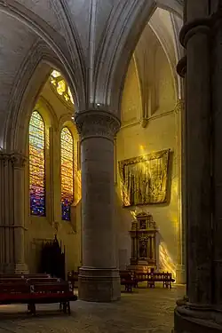 Thirteenth-century developments include the clerestory, with moulded windows, statues of angels and an oculus. The Anglo-Norman architectural influence can be seen, among other places, in the cathedral's sexpartite rib vaulting. The temple is of great dimensions, has a length of 120 meters and 36 meters of height, in its internal central area, occupying an area of 10,000 square meters.[4][7] In the 15th century, the eastern end was rebuilt to create a double ambulatory. In the 17th century, the cathedral chapter retained architect Ventura Rodríguez to build the altar of Saint Julian, also known as el Transparente for the stained glass illuminating and decorating the background of the altarpiece. It rivalled altarpieces with similar features by Narciso Tomé in Toledo Cathedral.[8] A new altar was built in the eighteenth century, with altarpiece statues by Italian sculptor Pasquale Bocciardo.