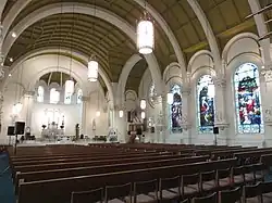 The cathedral is designed in an Italian Romanesque Revival style. The exterior of the structure is faced with red brick accented with granite. The facade is framed by two square towers that reach a height of 164 ft (50 m).[6] The interior was most recently renovated in 2019 when the sanctuary was covered in marble and a new marble altar and pews were installed. The new marble altar was a gift of Tim and Sherry Murphy in memory of their families. The old high altar, topped by a Calvary scene, remains in the apse. It was a gift of the Patsy Clarke family of Spokane. The bishop's cathedra (chair) is a combination of the original 1913 throne of Bishop Schinner, the marble cathedra from the 1930s and a new addition in 2018. The bishop's cathedra is a gift from the Dennis and Stacy Harrington family in memory of Deacon John Sicilia. The restored marble pulpit was made possible through the generosity of Mr. and Mrs. Paul Redmond. The cathedral has one organ in the loft W. W. Kimball pipe organ. The stained glass windows are from Bavaria.[4]