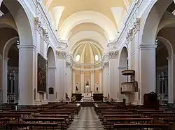 The interior has a large barrel-vaulted nave, and all around this is an entablature supported by pilasters which have Corinthian capitals. There are three chapels on each side of the nave, connecting with each other and each having a semicircular apse; the large spaces between them give the effect of side aisles. The chancel is raised a few steps above the nave and was at first enclosed by a marble baluster, which was taken out after the restoration work done between 2000 and 2006. At the east end of the cathedral is a semicircular apse, furnished with wooden choir stalls.[11]