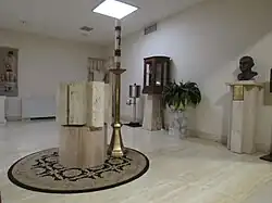 The baptistry is also located at the entrance. The baptistry was remodeled in 2006. Two skylights in the ceiling bathe the font in natural light. The font is the original Italian marble baptistry made for the cathedral. The floor is made of similar marble to that which is in the sanctuary. An ambry, built in 2004, resides in the baptistry and is made of wood and glass. It contains the oil of the sick, Sacred Chrism, and the oil of the Catechumens, blessed at the Chrism Mass, which is celebrated each Lent in the cathedral. A statue of the Risen Christ is also present.