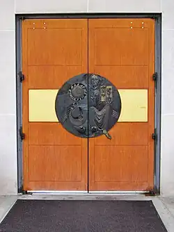 The main doors of the cathedral are 500 pounds each and are a replacement of the original doors. Due to the building standing on a slope, the doors open at ground level. Decorative embellishments to the light-finished wooden doors are a reminder of Christ. The doors were designed by Brother Stephen Erspammer, S.M., of St. Louis. The right and left sets of doors have handles in the shape of a Greek Alpha and Omega, recalling John's beatific vision of Christ in Revelation. A bronze medallion embedded in the center set of doors depicts an eternal Christ, seated among the sun, moon, stars, and rainbows of the heavens. With one hand, the figure makes the ancient gesture of a teacher. The other hand holds the book of Scriptures, with the words "Ego sum lux mundi," which means "I am the light of the world." The Christ image is situated on one side of the medallion, so that it remains whole, even when the Cathedral doors are open. The style is in keeping with ancient Church art and the contemporary design of the cathedral. From a practical standpoint, one of the sets of doors has an electric device that helps people with disabilities to open the door, making the Cathedral accessible to the disabled. The doors were commissioned and blessed by Bishop Gaydos. The blessing took place in June 2001 on Pentecost Sunday.[3]