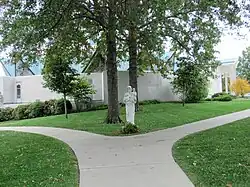 The campus features a 5-foot (1.5 m) solid marble statue of St. Joseph and the Christ Child. It faces east toward the Carmelite monastery and the chancery and is located on the east lawn. It was added to the campus in 2005 from a closed parish in St. Louis. Also on the east lawn, there is a pin oak, known as the Pentecost Tree, which was planted by Bishop Gaydos in 1999. Soil used to plant the tree was brought to the campus from each of the parishes of the diocese. At the Bishop's entrance to the cathedral, is a modern, concrete sculpture of St. Francis and the animals. It is a two-sided sculpture that is the work Siegfried Reinhardt of St. Louis. It was donated to the cathedral in 2009 by a parishioner. There is a cornerstone also near the Bishop's entrance. A limestone engraved sign adorns the front lawn. It was installed in 1985. There is a grotto of Our Lady of Fatima, which includes the figures of the Blessed Mother, the three seers, and animals. It is located on the south lawn and was donated by the closed LaSalette Seminary. Each of the figures is made of concrete and was restored in 2009.